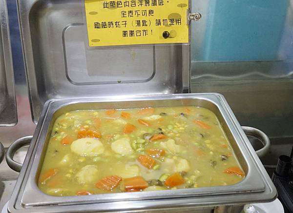 下面那三桶由左而右:自製有機豆漿、紫菜湯、玉米濃湯